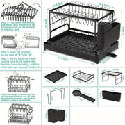 Ten 2-warstwowy zlew oferuje wystarczająco dużo miejsca, aby efektywnie osuszyć wszystkie naczynia. Solidna stal nierdzewna w połączeniu z matowymi czarnymi elementami z tworzywa sztucznego zapewnia stylowy i trwały wygląd. Regulowana konstrukcja oraz obrotowa płyta odpływowa ułatwiają użytkowanie i zapewniają higienę. W zestawie uchwyt na sztućce i stojak na kubki, dzięki czemu wszystko można przechowywać w sposób uporządkowany i schludny.