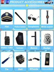 - W zestawie: Mundur policjanta, czapka, okulary przeciwsłoneczne, pałka, kajdanki, odznaka, radio, zegarek, krawat i pasek