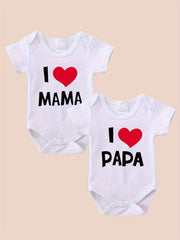 Ten uroczy, dwuczęściowy zestaw body dla niemowląt ma wesołe napisy "I ♥ Mama" i "I ♥ Tata". To idealny zestaw na letnie chwile z rodzicami. Miękka bawełniana tkanina zapewnia komfort Twojemu dziecku, a trójkątny krój i krótkie rękawy są doskonałe na ciepłe dni. Napiecie ułatwia zakładanie, a wesoły napis nadaje zabawny wygląd. Ten zestaw jest idealny na letni wypad lub po prostu na relaks w domu.