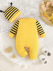 Ten wesoły, 2-częściowy zestaw jumpsuit dla niemowląt składa się z wygodnego kombinezonu z uroczym wzorem pszczółek oraz dopasowanej czapeczki. Paskowy wzór zapewnia świeży wygląd, idealny na pierwsze przygody na świeżym powietrzu. Miękka bawełniana tkanina sprawia, że Twoje dziecko czuje się komfortowo przez cały dzień, a praktyczne ogrodniczki i czapeczka zapewniają dodatkową ochronę przed słońcem. Ten zestaw jest idealny na wycieczkę do parku lub przyjemne popołudnie w ogrodzie.