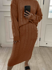 Zestaw Swetra Luna Plus-Size oferuje najwyższy komfort i styl na chłodniejsze miesiące. Zestaw składa się z dzianinowego topu z okrągłym dekoltem oraz pasującej spódnicy, wykonanych z luksusowego splotu warkoczowego, który emanuje zarówno ciepłem, jak i elegancją. Ten wszechstronny strój jest idealny na codzienne dni, ale także doskonały na bardziej elegancką okazję. Miękka tkanina i ponadczasowy wygląd sprawiają, że ten zestaw jest niezbędnym uzupełnieniem Twojej garderoby na jesień i zimę.
