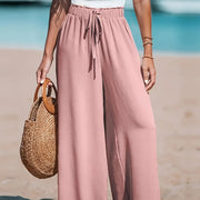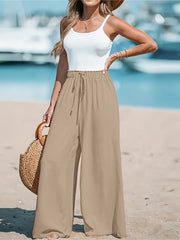 Tyto dámské kalhoty jsou navrženy s vysokým pasem a širokými nohavicemi, aby poskytovaly stylový a pohodlný střih. Prodyšný, neelastický materiál zajišťuje přirozený vzhled a příjemné nošení po celý rok. Nastavitelný pas se šňůrkou umožňuje perfektní přizpůsobení postavě. Ideální pro každodenní i elegantní stylizace, snadno kombinovatelné s různými topy.