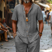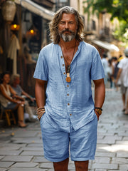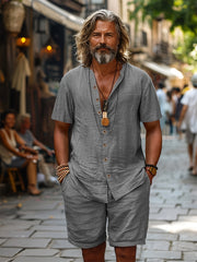 Tato pánská sada se skládá z prodyšného kardiganu s krátkými rukávy a odpovídajících šortek, ideálních na teplé dny. Lehký materiál z lněné směsi zajišťuje prodyšné pohodlí a uvolněný vzhled. Díky volnému střihu si můžete užít maximální volnost pohybu, což je ideální pro odpočinek nebo letní procházku. Stylová volba pro každou letní příležitost.