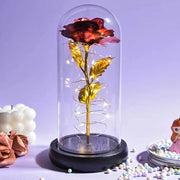 Wnieś miłość i elegancję do swojego wnętrza z tą 24-karatową złoconą różą wieczności w szklanej kopule. Ta piękna róża zawsze będzie w pełnym rozkwicie, co czyni ją idealnym symbolem wiecznej miłości i wdzięczności, doskonałym na Dzień Matki. Subtelne oświetlenie LED podkreśla złote odcienie i tworzy ciepłą, przytulną atmosferę. Idealna jako dekoracja w Twoim salonie lub jako szczególny prezent dla bliskiej osoby, ta róża dodaje ponadczasowego uroku każdemu pomieszczeniu. Podaruj swojej mamie prezent, którego nigdy nie zapomni.