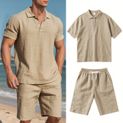 Ten lniany zestaw składa się z wygodnej polówki z krótkim rękawem oraz pasujących szortów. Oddychający materiał lniany zapewnia chłodny i świeży komfort, idealny na letnie aktywności na świeżym powietrzu. Zestaw ma casualowy wygląd i oferuje swobodę ruchów dzięki lekkiej tkaninie i wygodnemu krojowi. Idealny, aby bez wysiłku cieszyć się stylem i komfortem latem.
