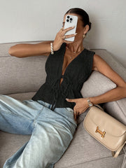 Bluză casual elegantă damă fără mâneci – stil francez cu decolteu în V și volane