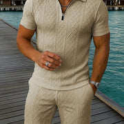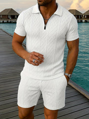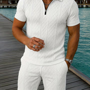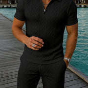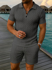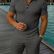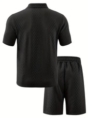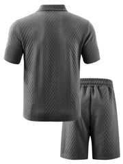 Acest set două piese combină confortul și stilul cu un design sportiv și casual. Modelul jacquard îi conferă un aspect rafinat, în timp ce poliesterul respirabil asigură că rămâi răcoros și uscat chiar și în zilele călduroase. Mâneci scurte și pantaloni scurți îl fac ideal pentru activități în aer liber sau o zi relaxantă de vară. Cu acest set, radiezi fără efort un look la modă și încrezător.