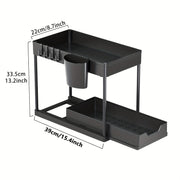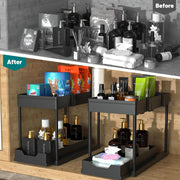 Acest organizator cu două niveluri oferă un spațiu inteligent de depozitare sub chiuvetă sau în dulapurile de bucătărie. Cu un cadru metalic solid și recipiente din plastic durabile, este potrivit pentru diverse obiecte. Designul glisant asigură acces facil și eficiență maximă. Ideal pentru menținerea ordinii în accesoriile de bucătărie, cosmetice și alte obiecte.